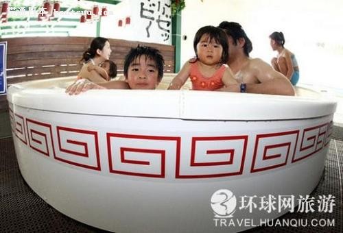 拉面温泉共有3个池子,白色的池壁外围描着一圈首尾相连的红色“回”字花纹,活脱脱一只特大号的面碗。每个池子上空悬挂着装饰用的大木筷,木筷还挑着一束足能以假乱真的“面条”。拉面温泉在温泉水中添加了胶原蛋白、马油和大蒜精华,经常用这种水浸泡身体,可以保养肌肤,胡椒的气味则能使人舒缓压力。 拉面温泉”中的面条不能吃,主要成分是润肤胶质,温泉老板称“拉面温泉”有很好的护肤效果。 ![]() 别具特色的拉面温泉
