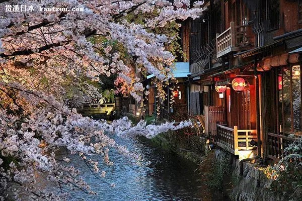 在京都祇园白川堤岸畔,一条石板小路二旁樱花盛放着,漫步其中特别醉人;堤岸旁一棵棵枝垂樱的长枝条从天而降,花影婀娜,洋溢着不可言表的朦胧美;行走在小河边,头顶着大片盛开的垂樱,欣赏那小桥流水,河对岸是成排的古色古香的花街茶屋,行色匆匆的艺妓擦身而过,一瞥惊鸿,令人流连忘返。 |