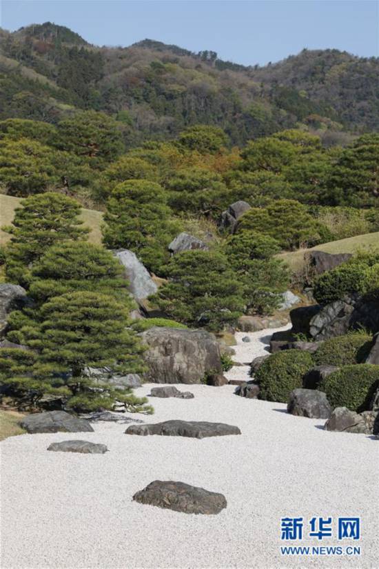 这是4月18日在日本岛根足立美术馆拍摄的日本庭院。日本庭院多用砂石制造出流水的效果。 新华社记者 杜潇逸 摄 |